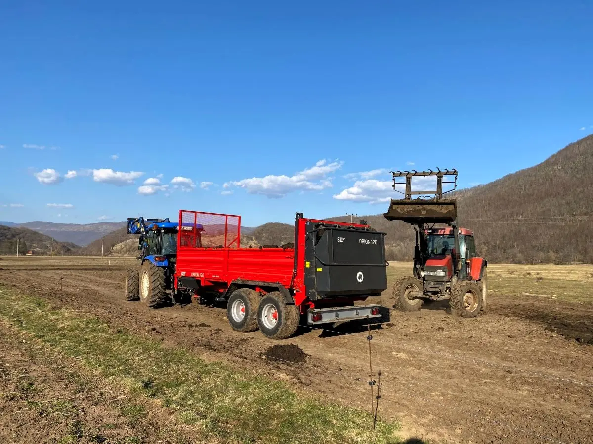 Za taj posao koristimo prikolicu za razbacivanje stajskog gnoja koja omogućuje ravnomjernu raspodjelu po cijeloj površini livade. Prikolica precizno rasipa gnoj u tankom sloju, što je važno kako bi hranjive tvari bile ravnomjerno dostupne travnoj vegetaciji i kako bi se izbjeglo stvaranje većih nakupina. Za pogon koristimo traktor Claas Arion snage 135 KS, koji se pokazao vrlo pouzdanim u radu na našim terenima. Kombinacija snažnog traktora i kvalitetne prikolice omogućuje učinkovit rad čak i na većim površinama, uz dobru kontrolu raspodjele gnojiva i minimalno opterećenje tla.